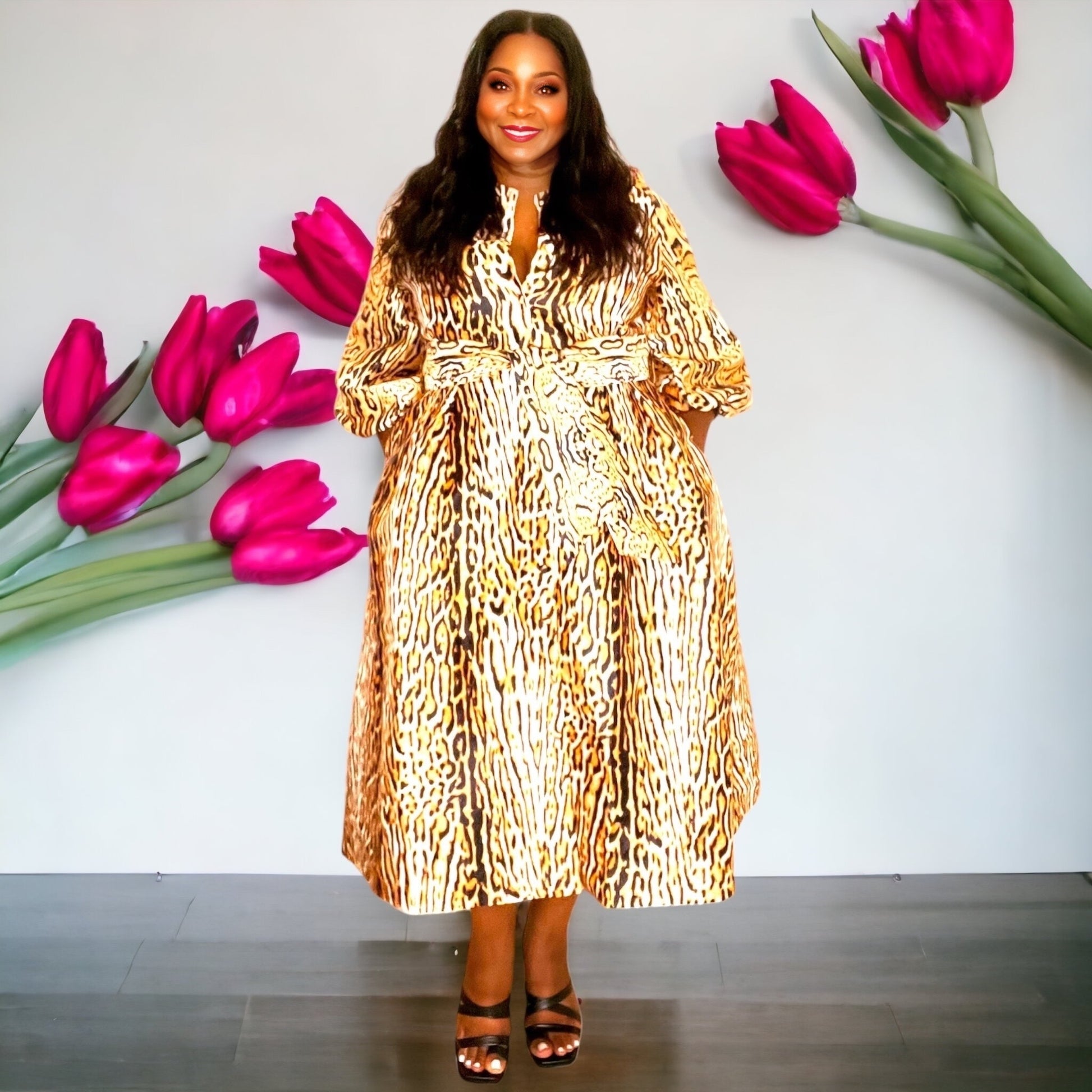 Bold print. Button up coat dress and matching tie belt. Voluminous sleeves. Midi length. Who says that beauty and strength aren't a match?