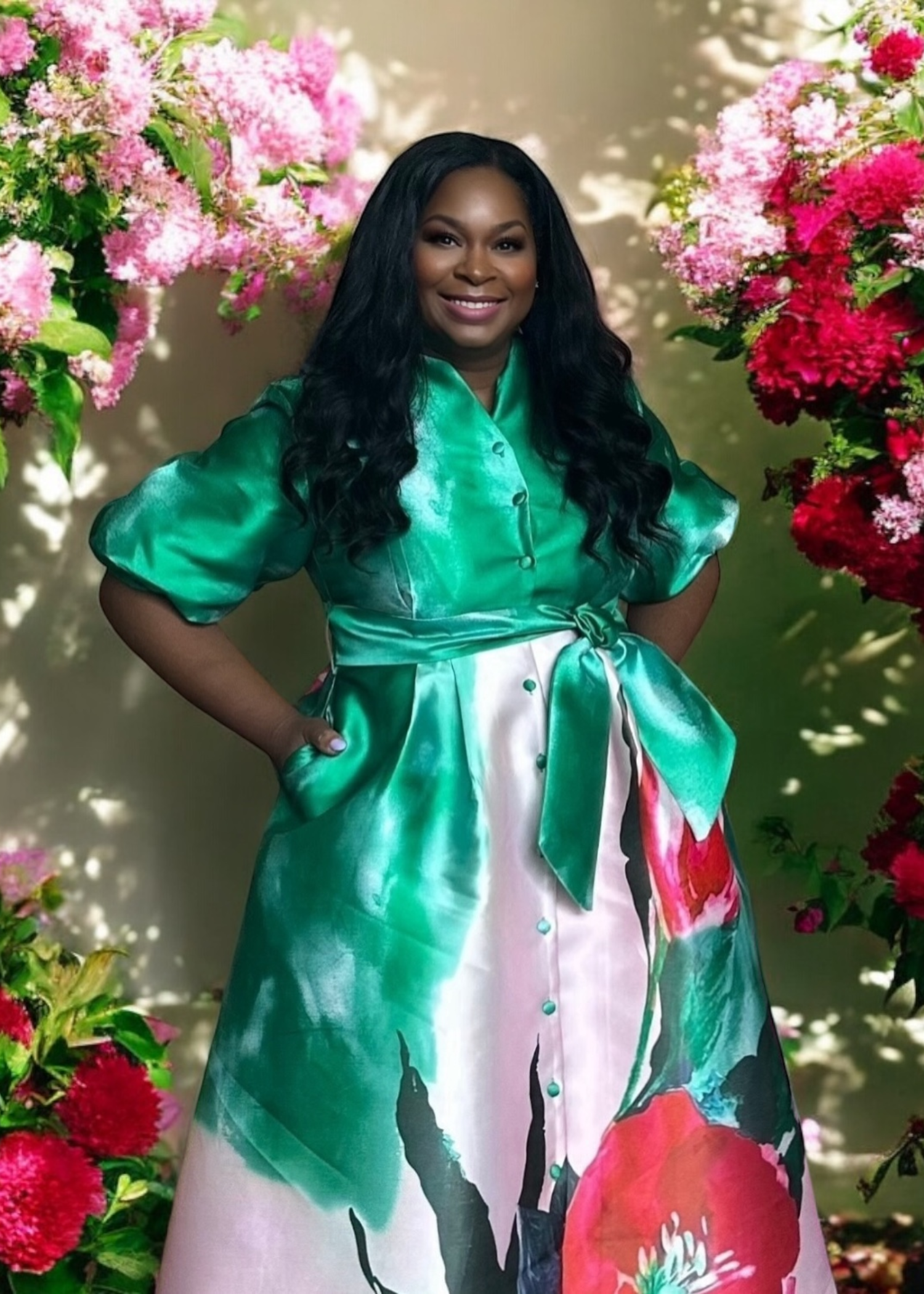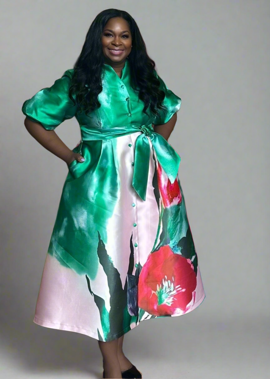 Add a touch of elegance to your wardrobe with Blooming featuring a stylish floral pattern and a classic button-up front. The A-line design flatters your figure, while the matching belt accentuates your waist for a sophisticated look. Elevate your style with Blooming today.