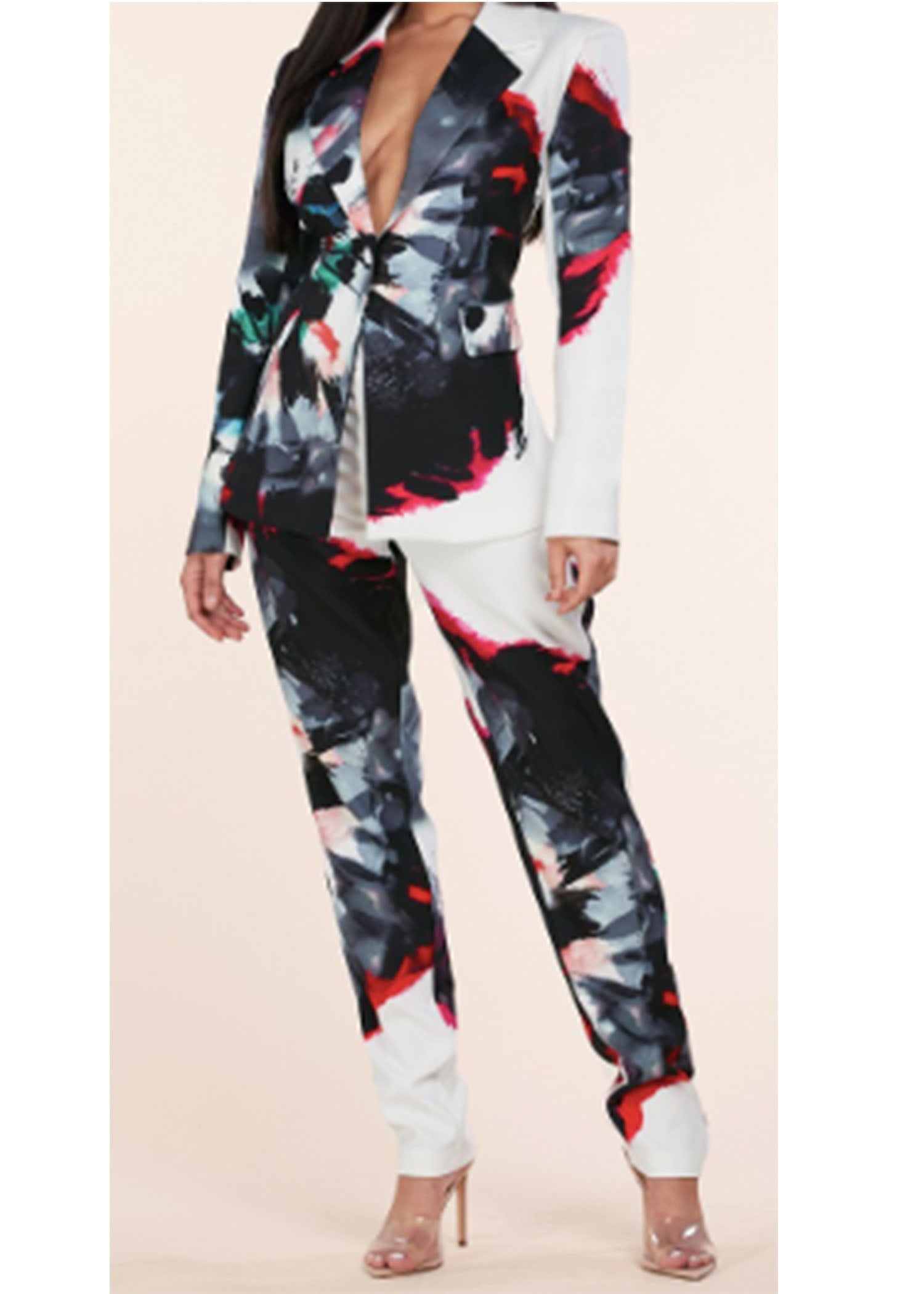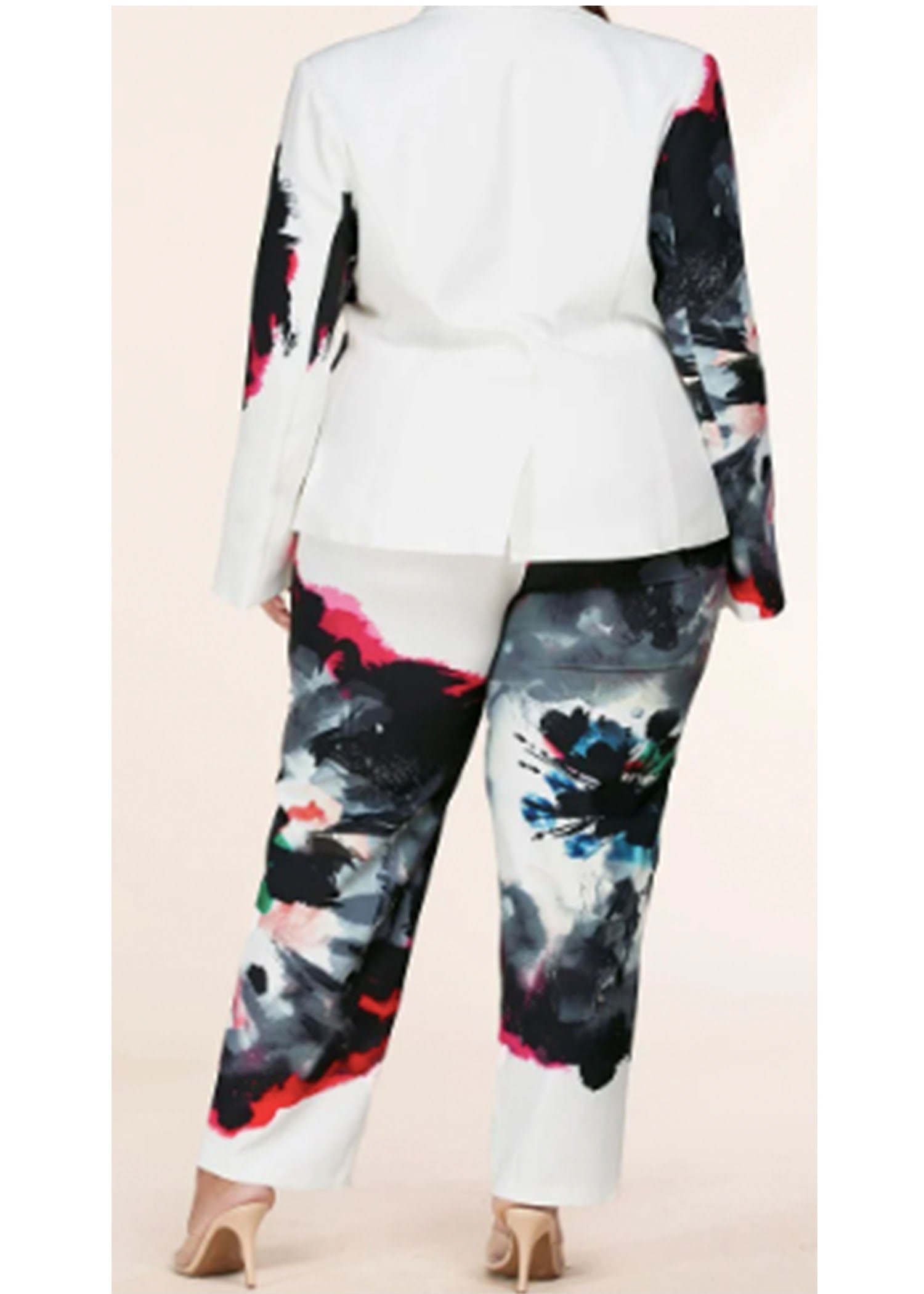 This 2-piece set showcases a striking abstract floral design on both the buttoned blazer and pants. The pants feature an elasticized back, zip up front, and button closure, ensuring a comfortable fit. Experience a noticeable impact with this stylish set, perfect for any occasion.