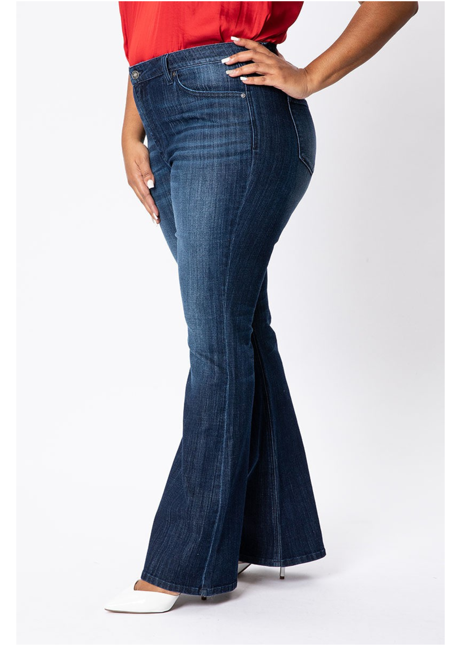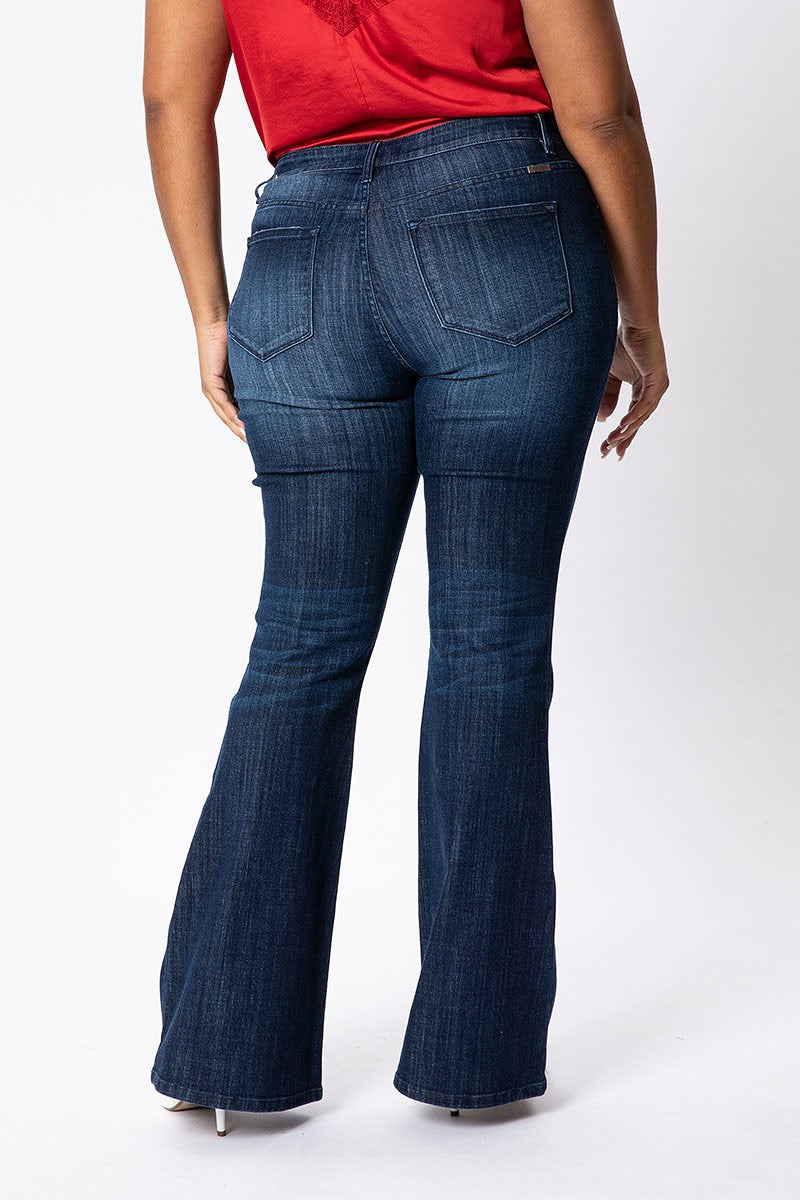 Express your style with flair in these high rise flare jeans. These jeans have a great amount of stretch and feature whiskering, fading, single-button closure, zip fly, and a 5-pocket design.