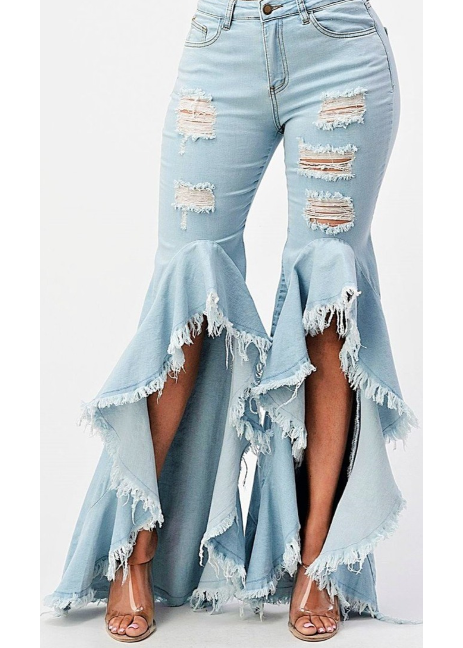 As fabulous as we all are, every one has a flaw. Does it mean that you are damaged? No longer worthy? Of course not. Just as the deconstruction of these jeans does not overcome the beauty of the design, you are still beautiful. The material of the denim is made to withstand the cuts and frays displayed on the front of the jeans as well as beneath the rear pockets and they have been turned into something more than beautiful. Dramatic cascades form from the knee down to gracefully reveal the legs that hold them up inside. You're still here for purpose. Instead of focusing on the flaws, focus on the beauty of what you do have. You'll discover that the beauty overcomes the flaws.