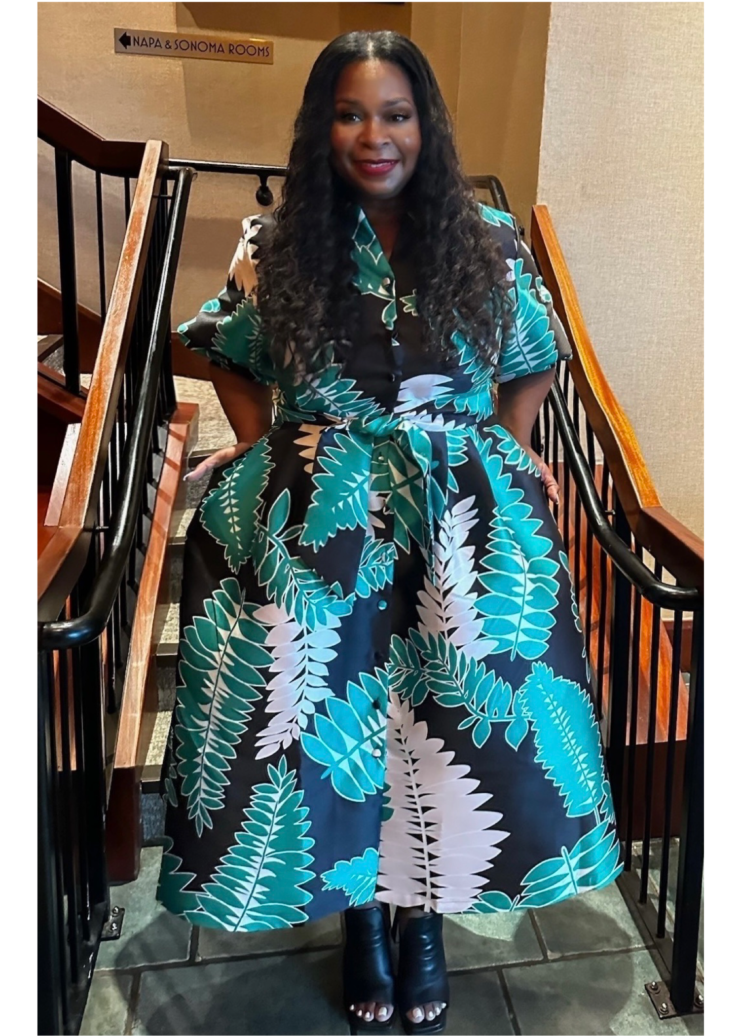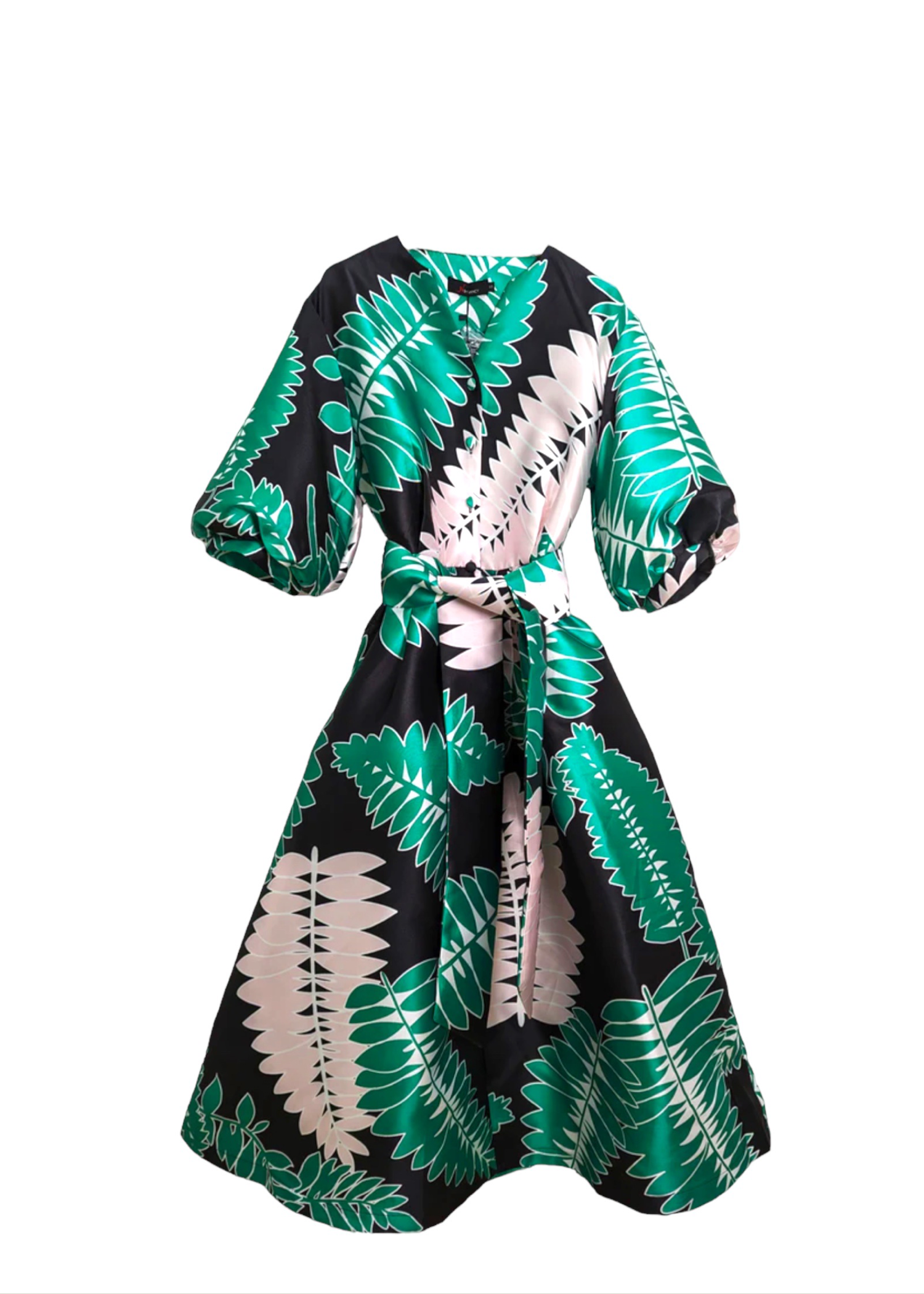Look like prosperity in this multicolored leaves beauty. It has balloon sleeves, buttons up the front, matching belt and full skirt.