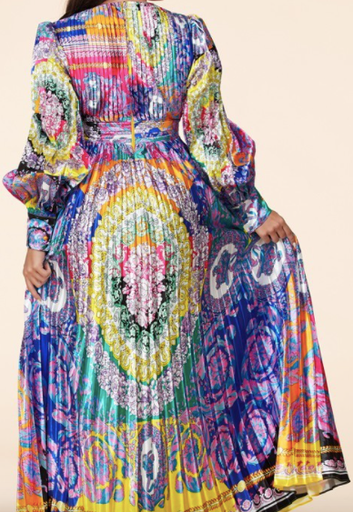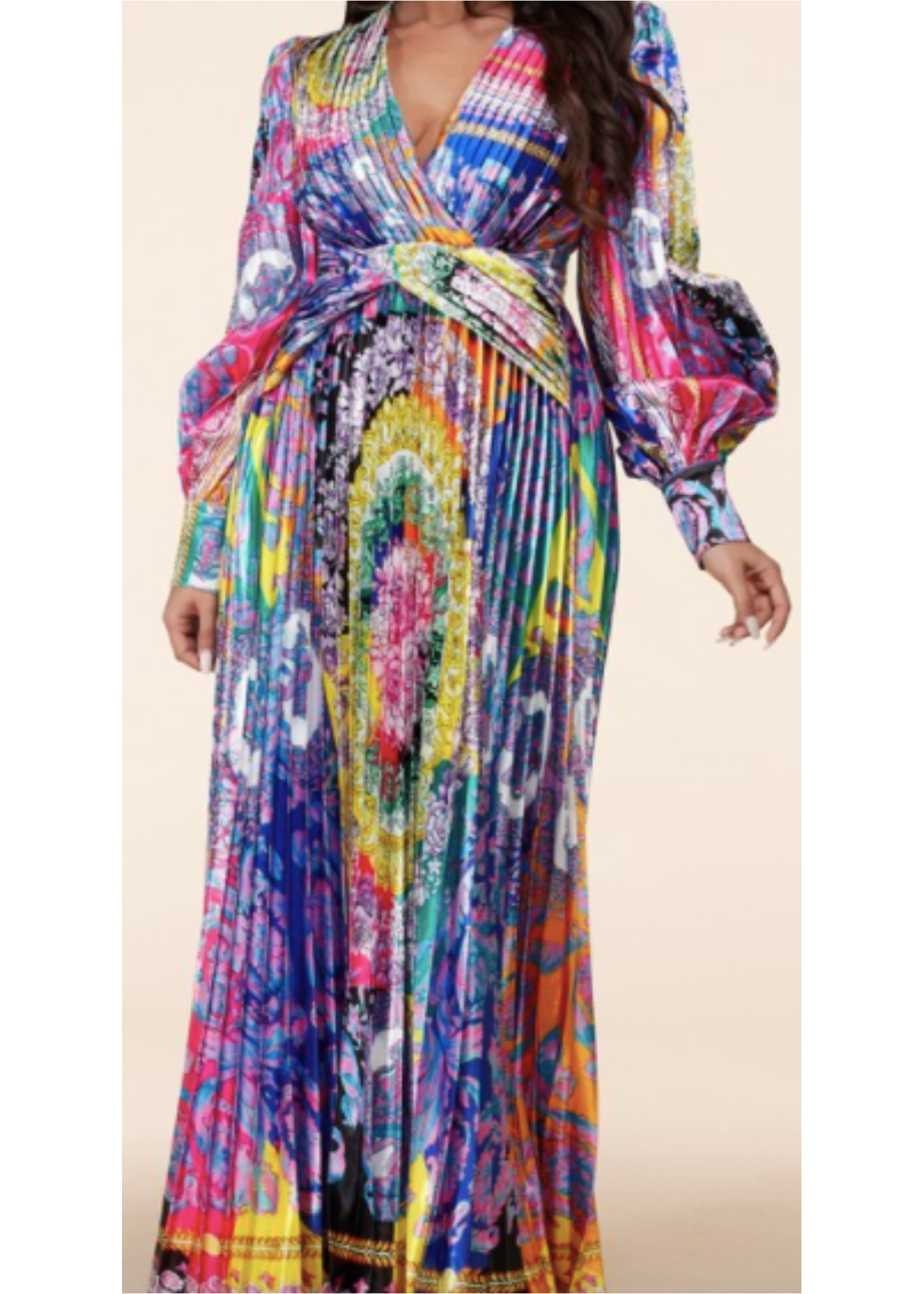 Have fun in this multicolored inspired boho print maxi. Featuring a deep pleated v neck, 4-button bishop sleeves, a twist detail waistband and accordion pleated maxi skirt with border print detail, you will feel and look as if you've found your pot of gold.