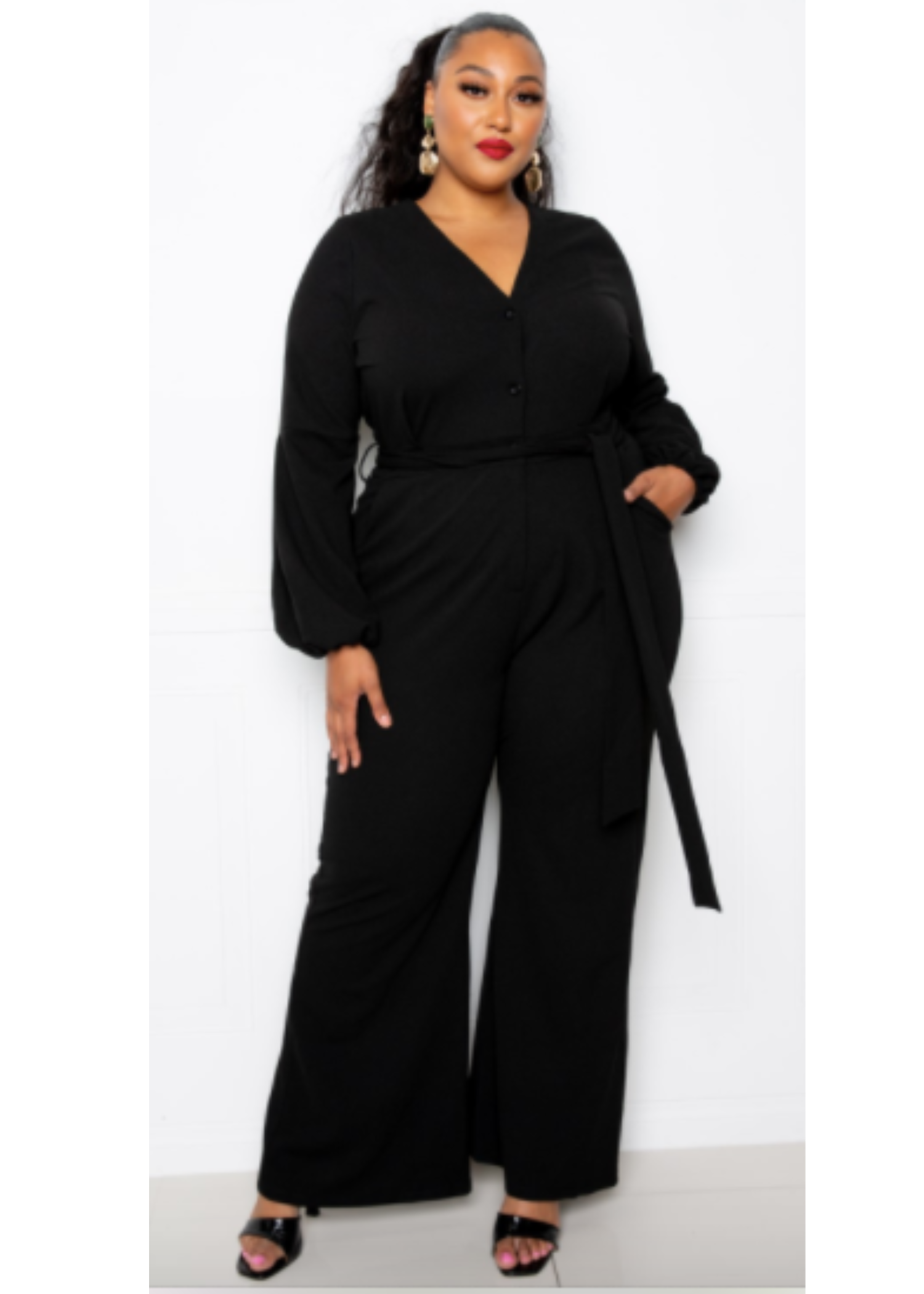 When faced with a busy day, this jumpsuit has got you covered. It boasts a button-up top, waist tie, and elasticized sleeves, all leading to a flared bottom. Mission Accomplished!