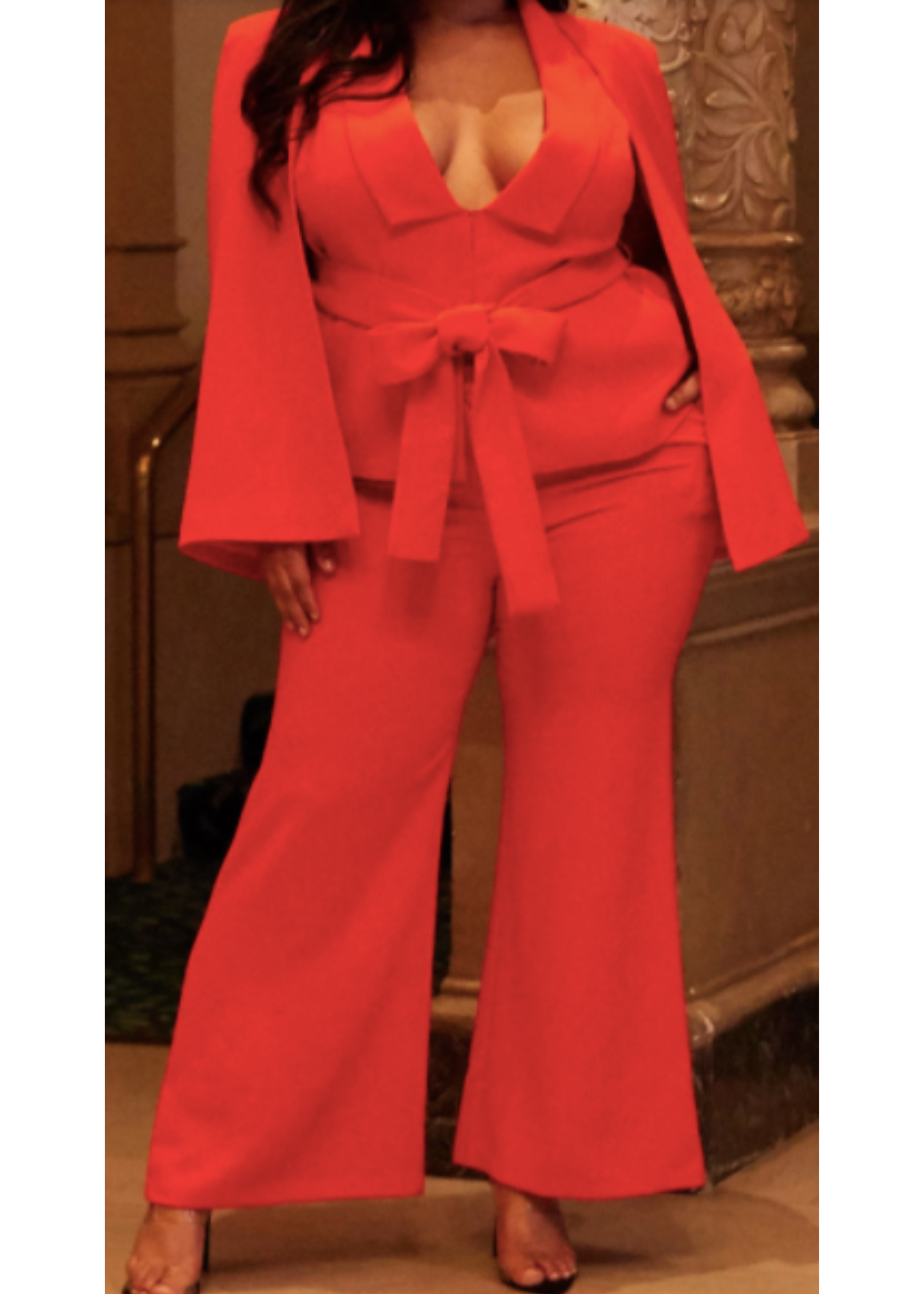 All "Sheroes" deserve to wear this caped blazer suit. Colored in a powerful coral red, the neckline of the jacket features a shawl lapel style, removable tie waist, and full lining. It is accompanied with bold bell bottom pants containing side pockets and a hook and eye/zipper closure in the back. Recognize that your presence is a gift to the world and an act of kindness, whether large or small, could just be the act that makes someone day. That makes you a heroine.