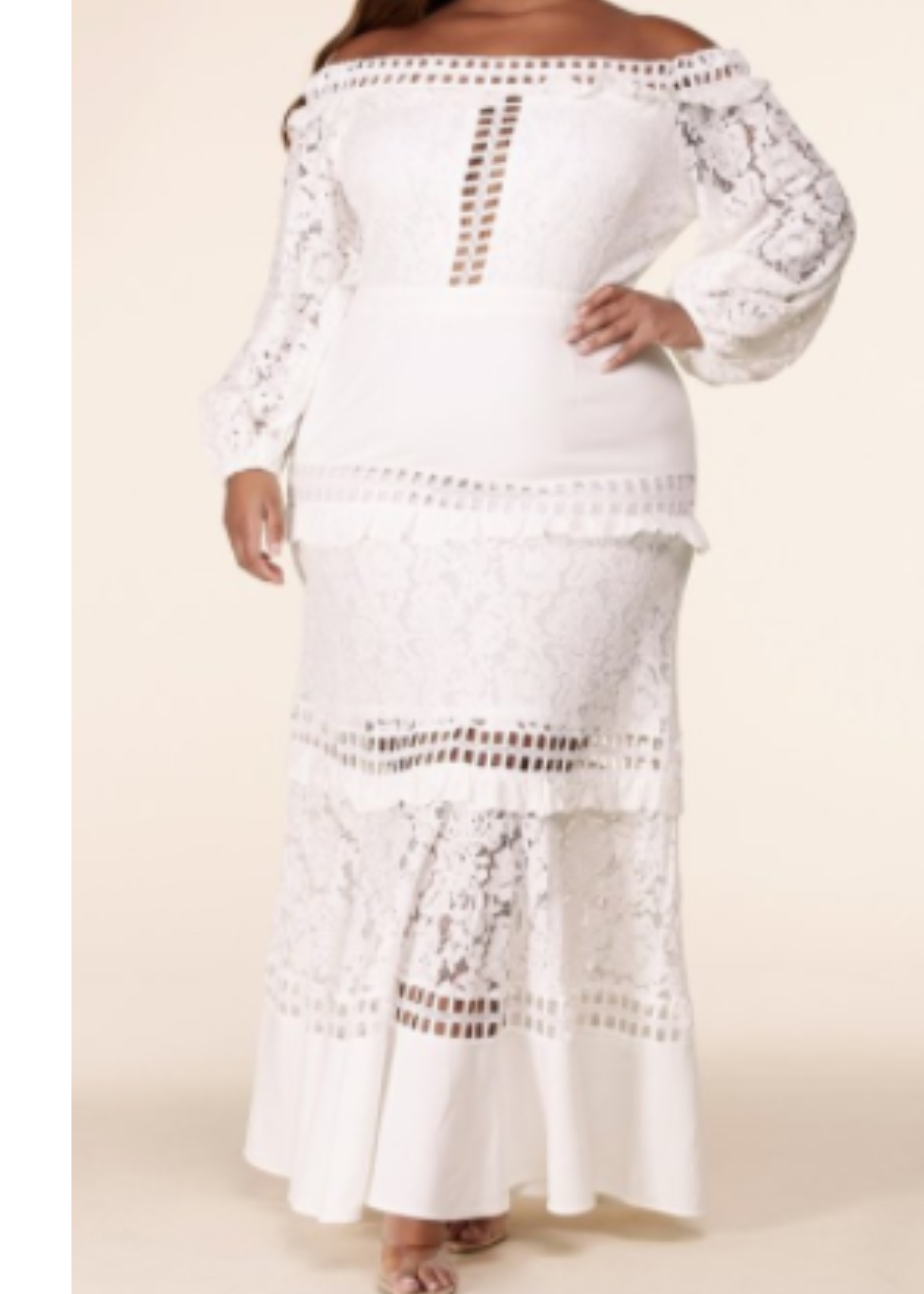 You'll be a vision of peace and loveliness in this white, off-the-shoulder, lace tiered maxi dress. It features an elasticized off-the-shoulder neckline with a flounce overlay and ruffled long sleeves. The bodice is fitted. It has an elasticized waist and a maxi skirt that flows with tiers of crochet lace. Now, go ahead and exhale. Not only do you look good, you may also feel good.