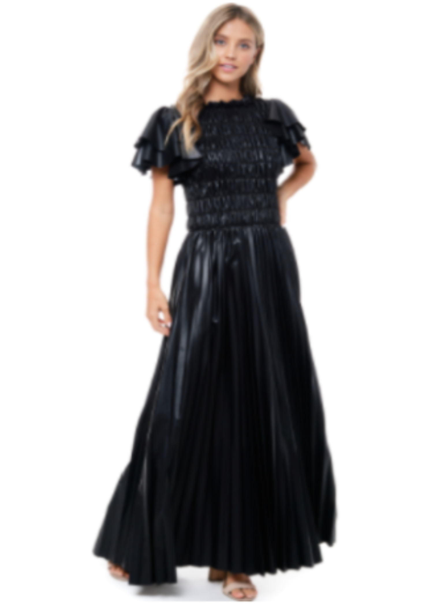 Always put your best self forward. Looking your best can be a part of this process. This vegan leather ruffled shoulder maxi dress elevates this style above a smocked chest and stretched waist with a pleated design. With the gifts that you possess, you bring something exceptionally unique to anything of which you are apart. Use the gifts wisely and excellently!