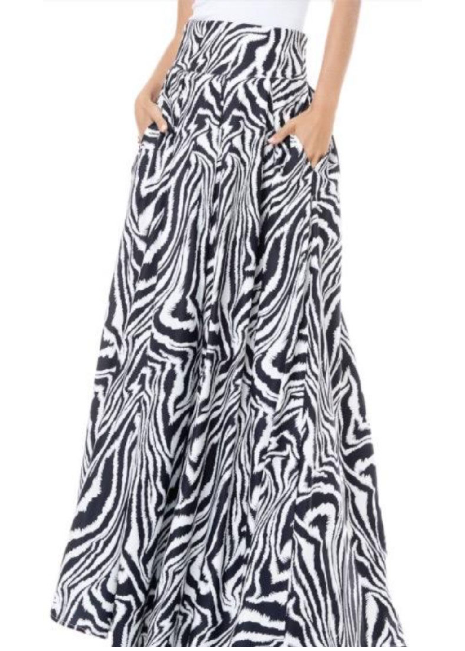 You are uniquely and wonderfully made. You will surely stand out in this zebra print maxi skirt with its A-line cut, elasticized waist and pockets. It will flow as graciously as you with every step that you take.