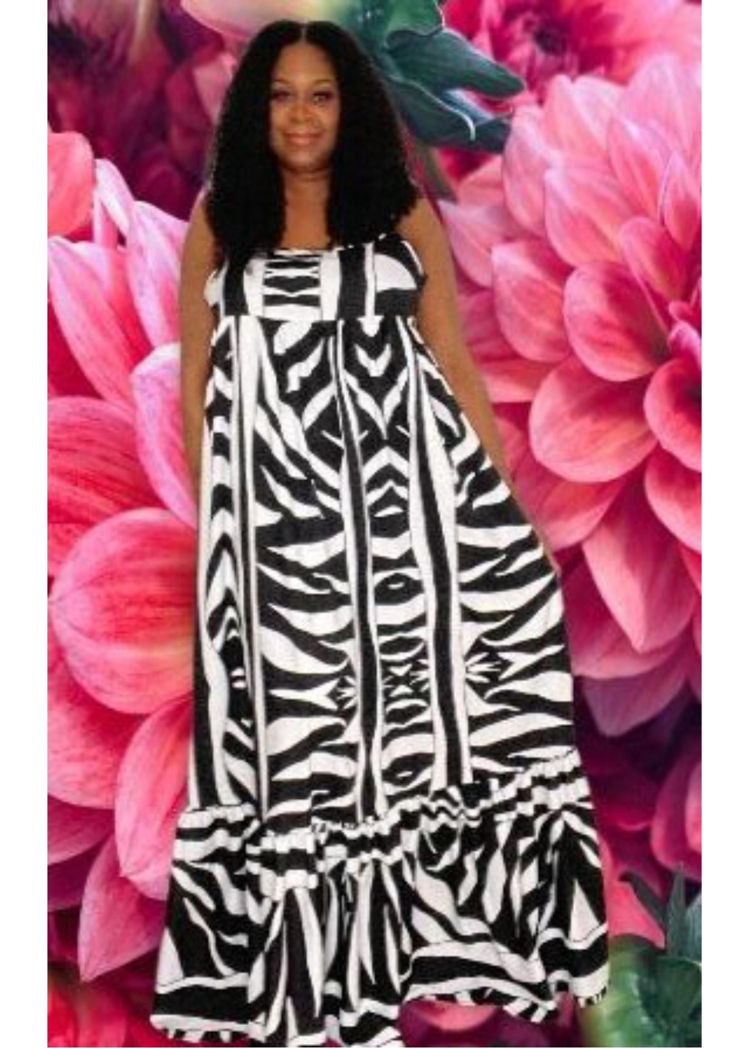 You'll feel like the queen that you are in this voluminous maxi dress. It has a harmonizing pattern of black and white, adjustable spaghetti straps, and a full ruffle on the hem.